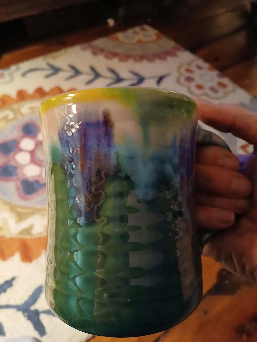 Compared to standard mugs on the market, the Teal Mug offers a larger capacity and a noticeably thicker, more durable ceramic construction. This makes it less prone to chipping and cracking than most mass-produced alternatives. Additionally, while many mugs are limited to single-color or printed designs, the Teal Mug stands out with its wide range of vibrant, hand-painted patterns and artisan touch, making each piece truly one of a kind.